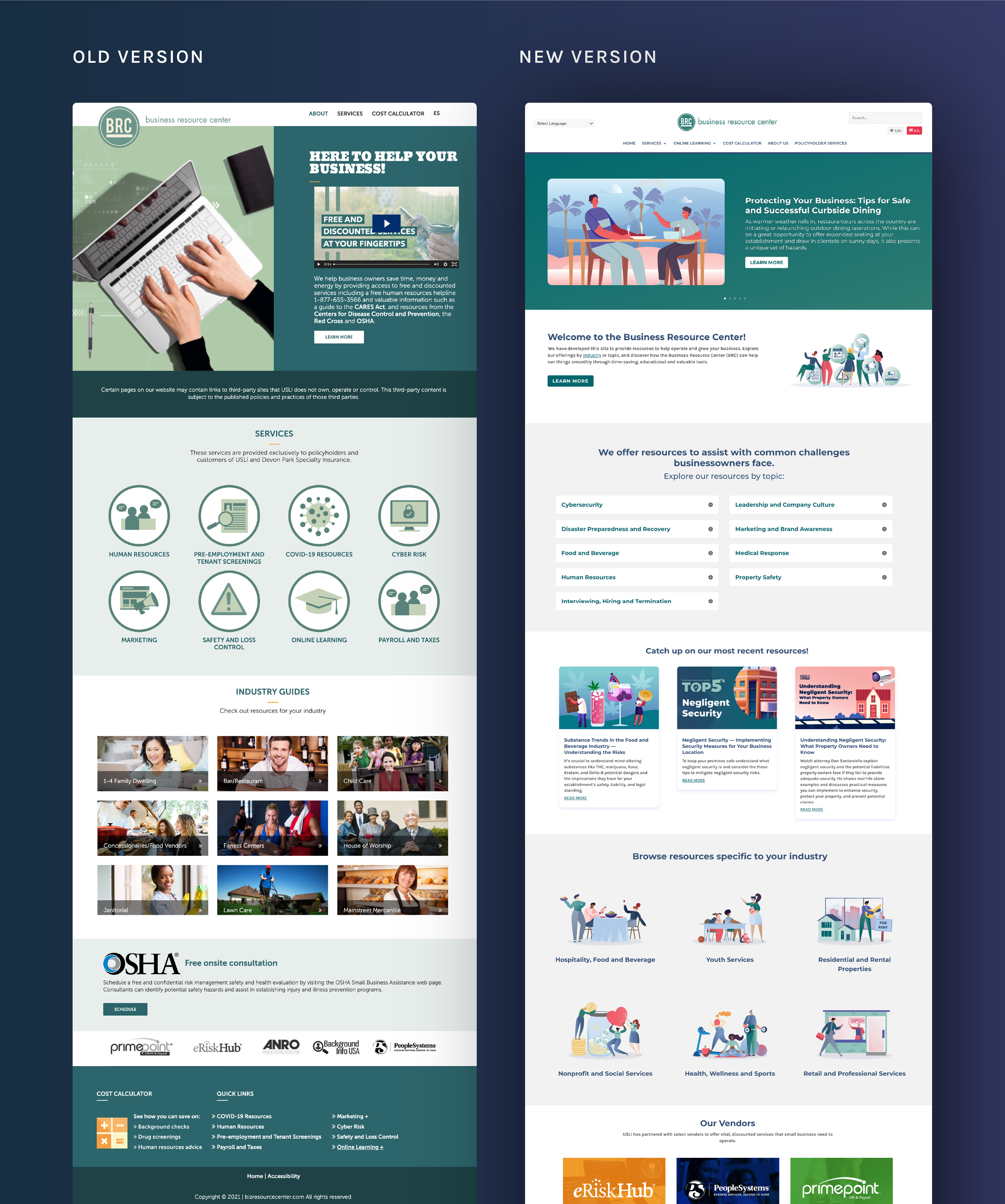 The Business Resource Center (BRC) was designed to support business owners with educational tools and services that help mitigate their risk while saving time and money. As the product designer I led the rebranding, full website redesign and lifecycle design, focusing on improved usability, scalability, and brand clarity. Additionally, I developed and executed the marketing strategy for multiple audiences launching omnichannel campaigns to increase engagement and usership.